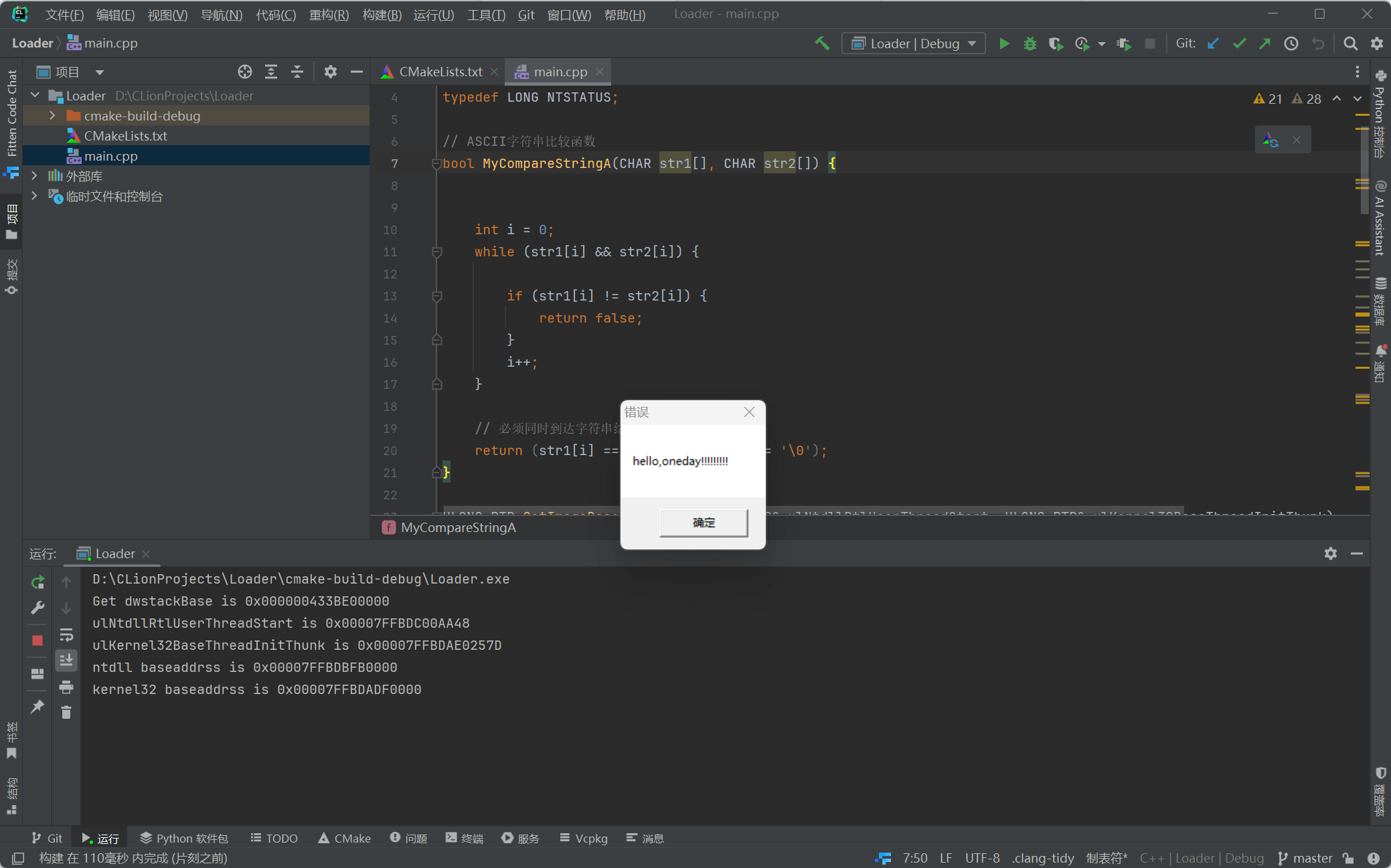 为什么代码中出现了 MyCompareStringA 自定义字符串比较函数?其实呢我最初的想法是往shellcode方向走的,能不用库函数就不用,当然你没这方面的要求可以换成其他的字符串比较函数。