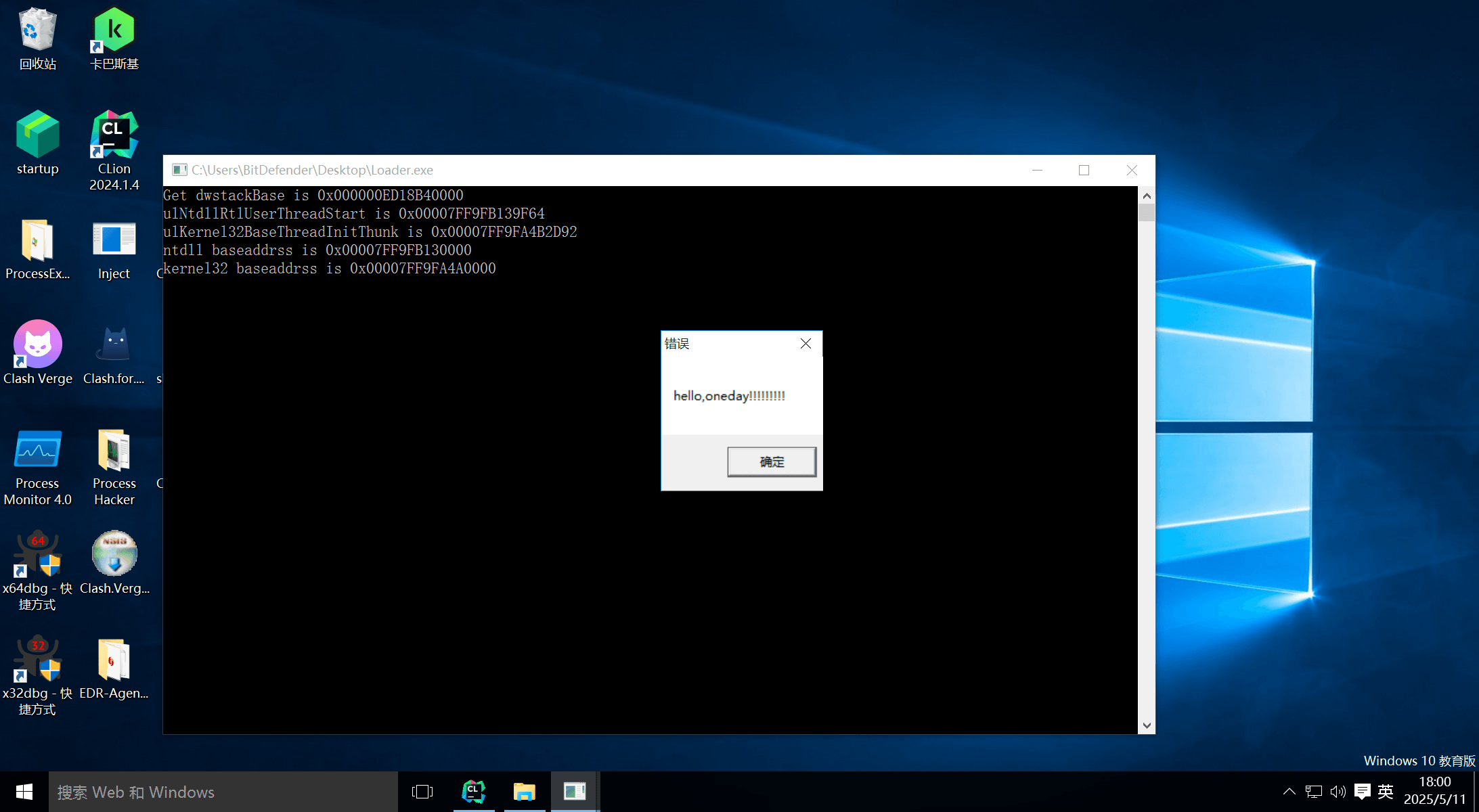 在windows11上,我用VS2022编译后能成功执行,但是在windows10上不能执行,出现问题的点在于获取kernel32基址上,这一块我暂时不知道原因,当然只用ntdll也能完成绝大多数功能。