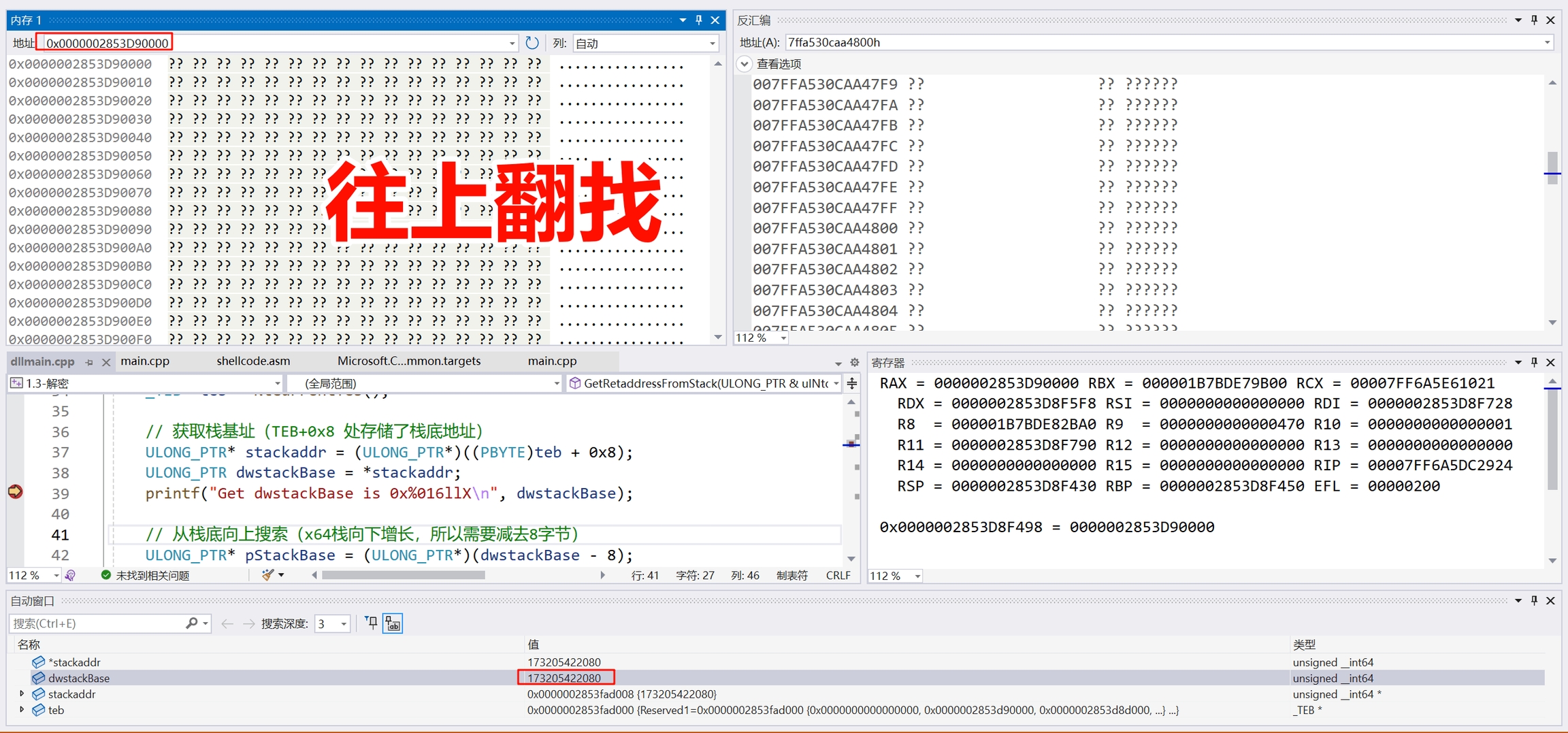 // 从栈底向上搜索(x64栈向下增长,所以需要减去8字节)