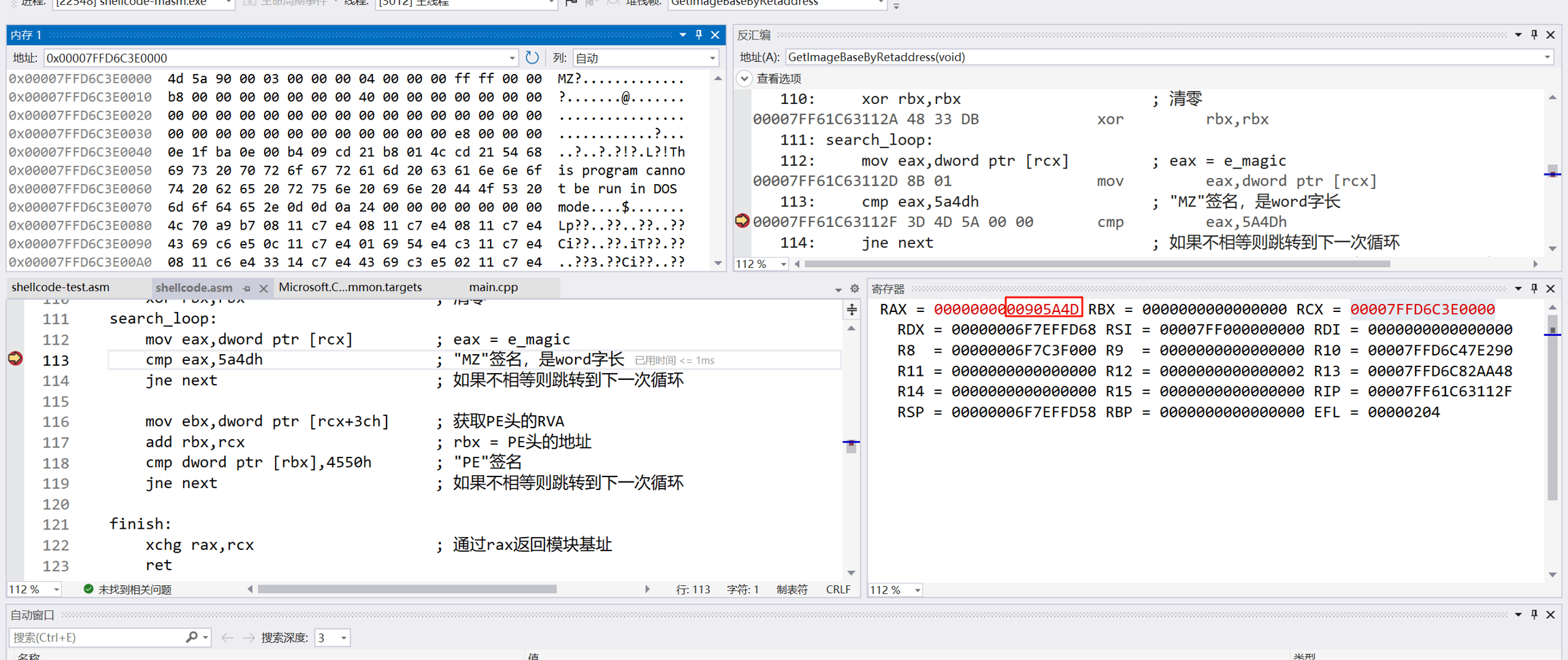 mov eax,dword ptr [rcx]和cmp eax,5a4dh应该修改成mov ax,word ptr [rcx]和cmp ax,5a4dh预设的边界值