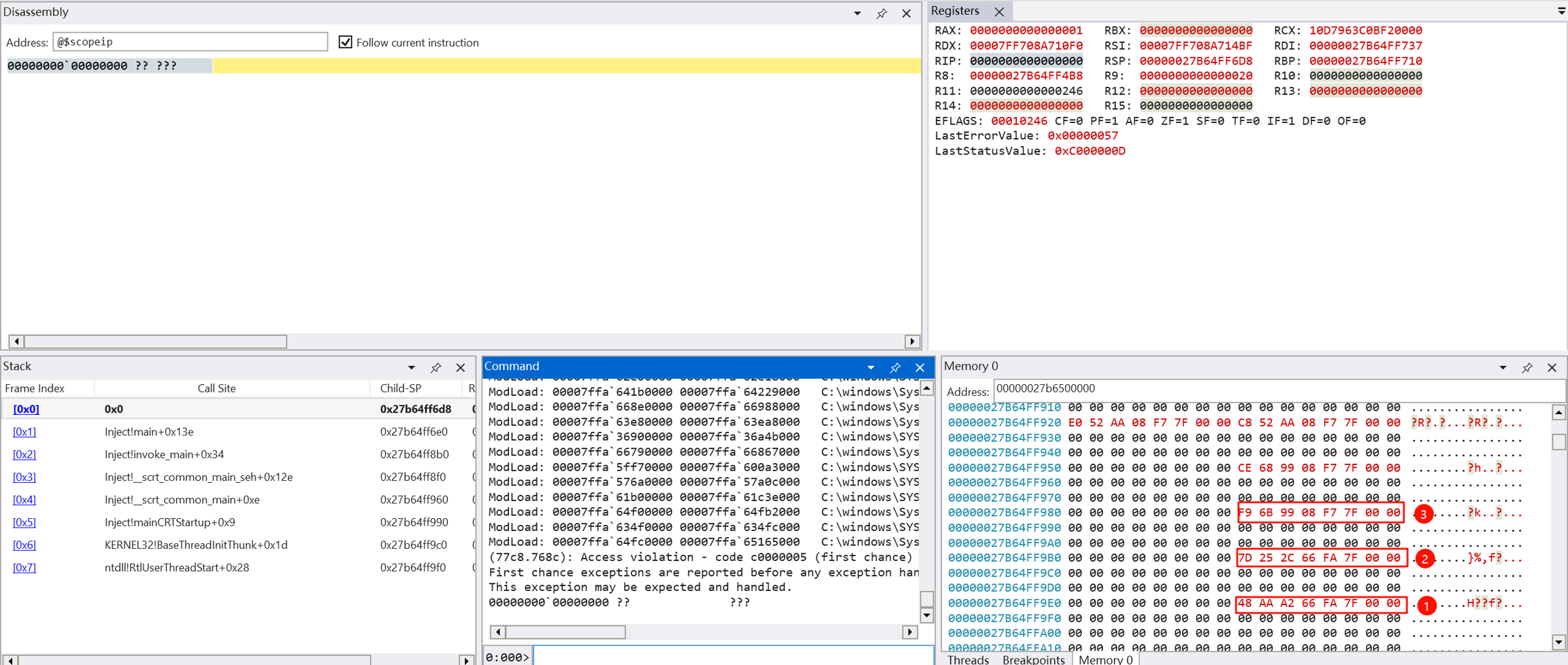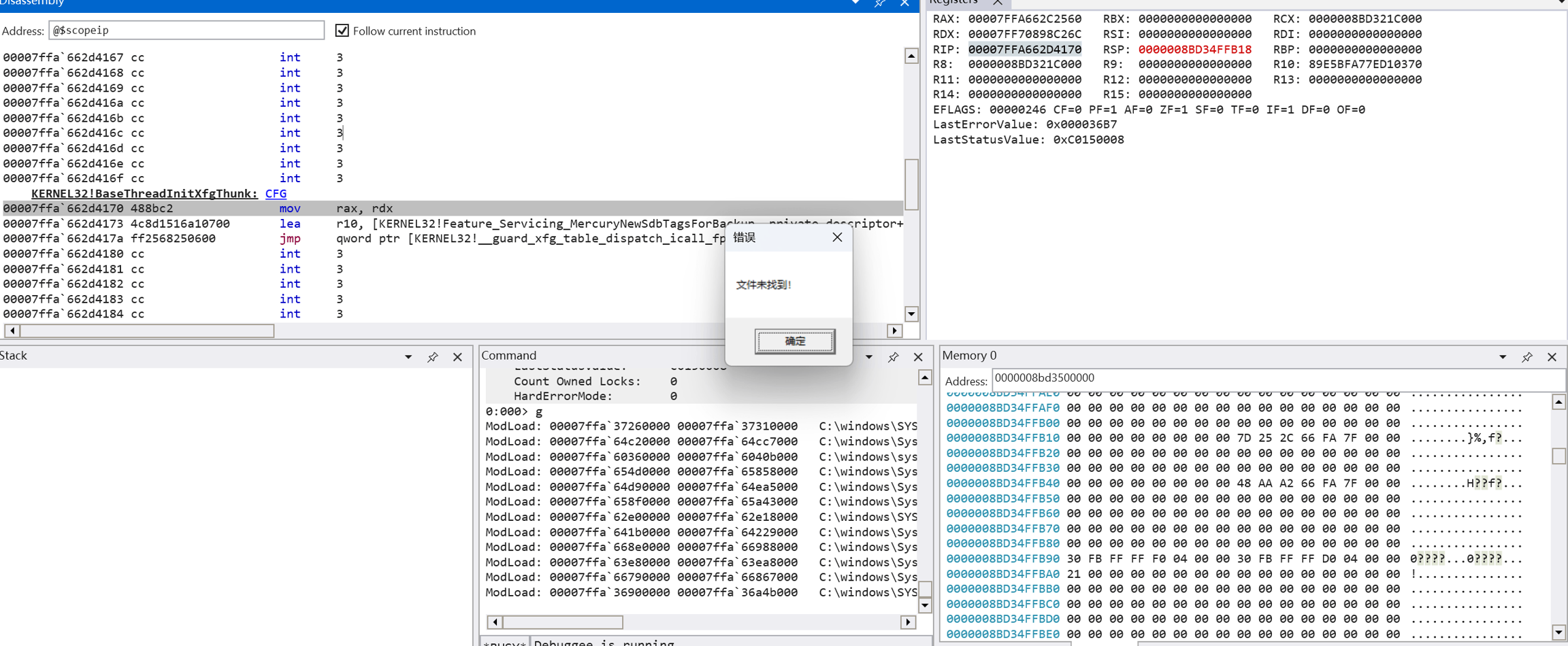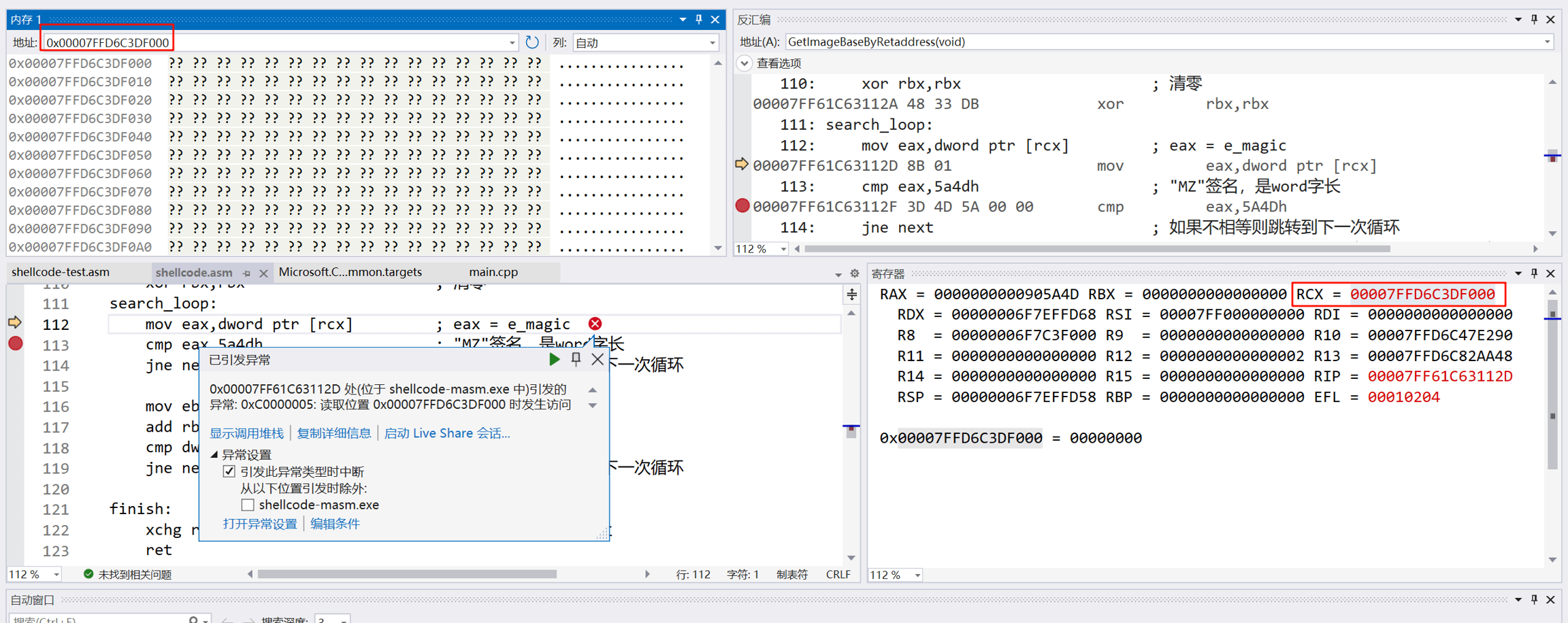 观察上图已经找到了DOS头,这时我们跳出(shift+F11),因为eax的值未正确匹配 5a4d, 程序理论上会进入到下一个循环,直到小于我们预设的边界值 7ff000000000h,但是这又会遇到下一个问题,程序直接抛出 0xC0000005 访问冲突错误,因为进入到不可读取的内存区域,这也意味着我们预设的边界值 7ff000000000h 并未起到实际作用。