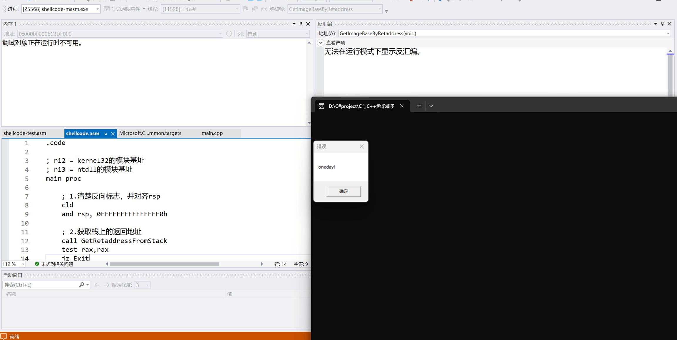 在最初的构想中,我是想调用 GetApiAddressByHash 后通过 rax 返回目标API的地址,然后再main函数中调用它,但是在实现的过程中遇到了一个难题:如果在main函数中通过 jmp rax 来调用目标API后,如何返回main中执行后续代码。为了解决这个难题,我实现了这样的一个结构