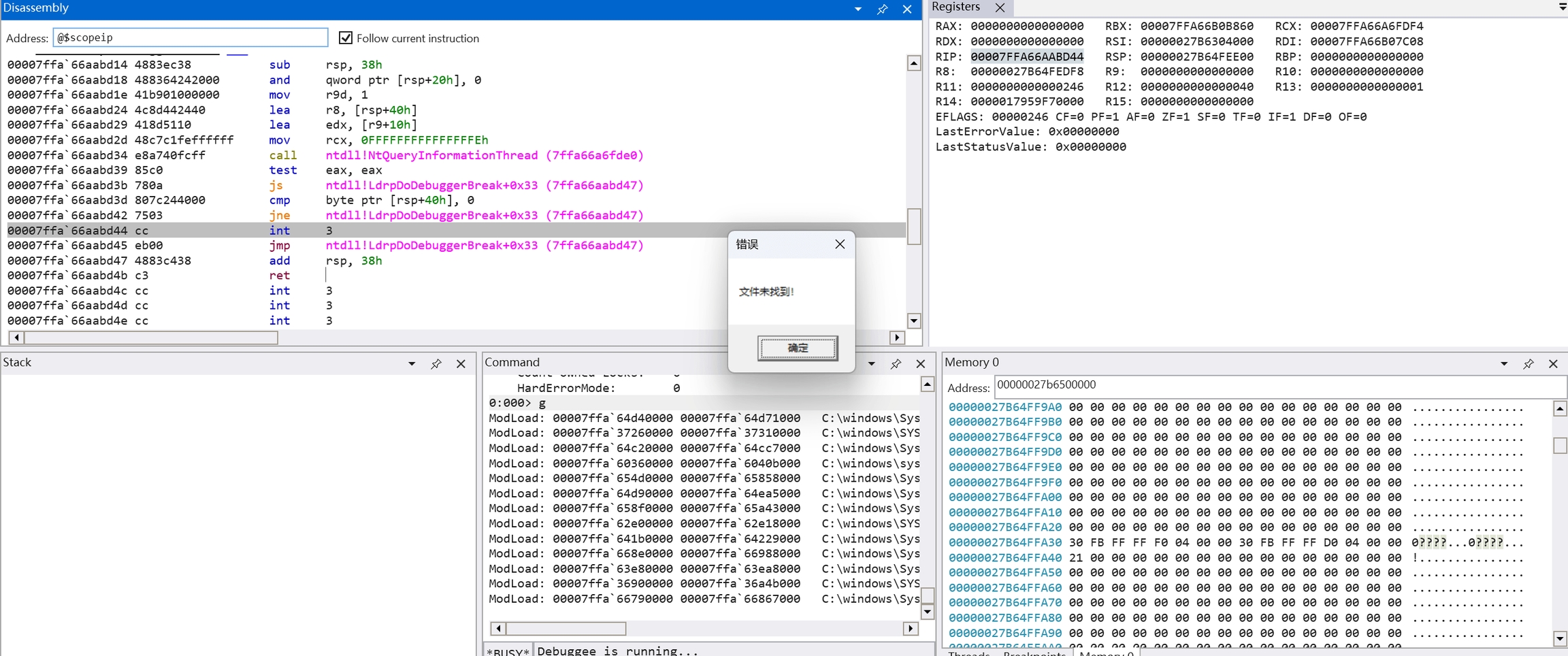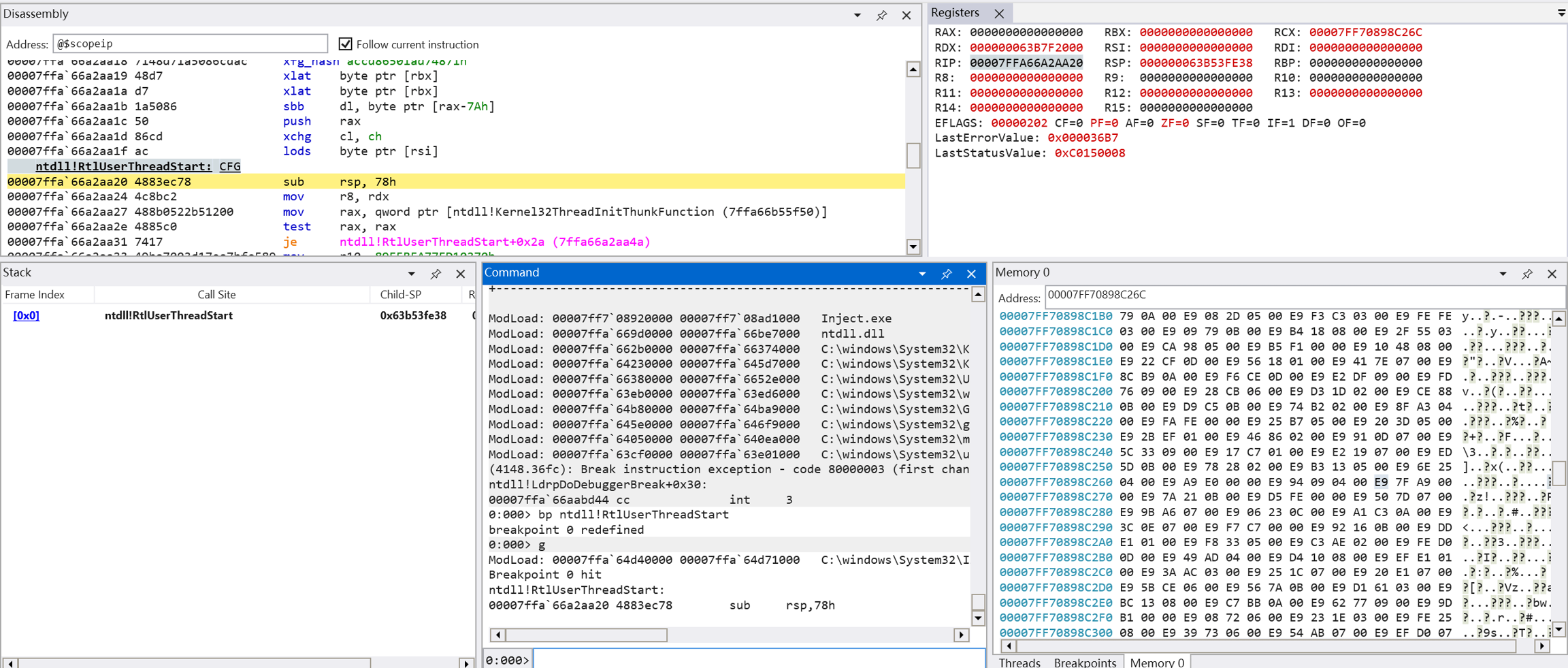 接着按F5运行,程序会停在 ntdll!RtlUserThreadStart 的入口点