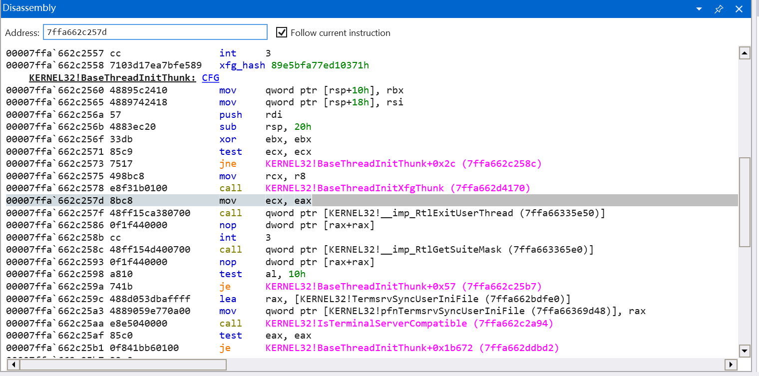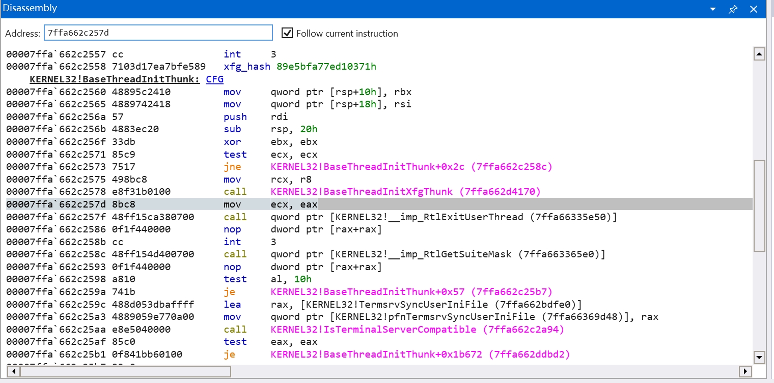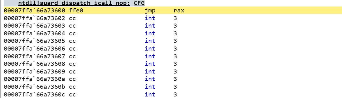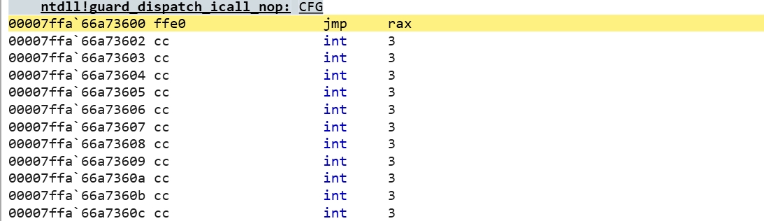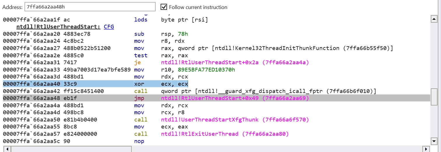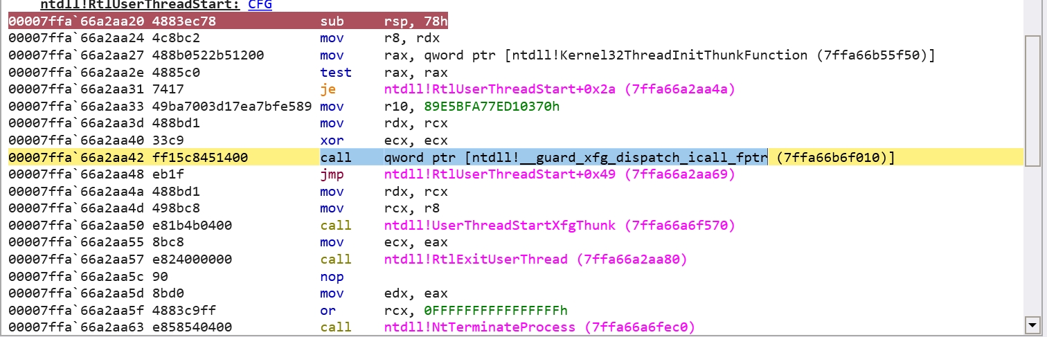 这个 ntdll!guard_dispatch_icall_nop 相当于一个中转站,最后通过 jmp rax 跳转到 KERNEL32!BaseThreadInitThunk