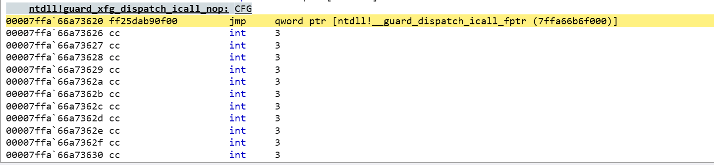 进入到 ntdll!__guard_xfg_dispatch_icall 后如下图所示