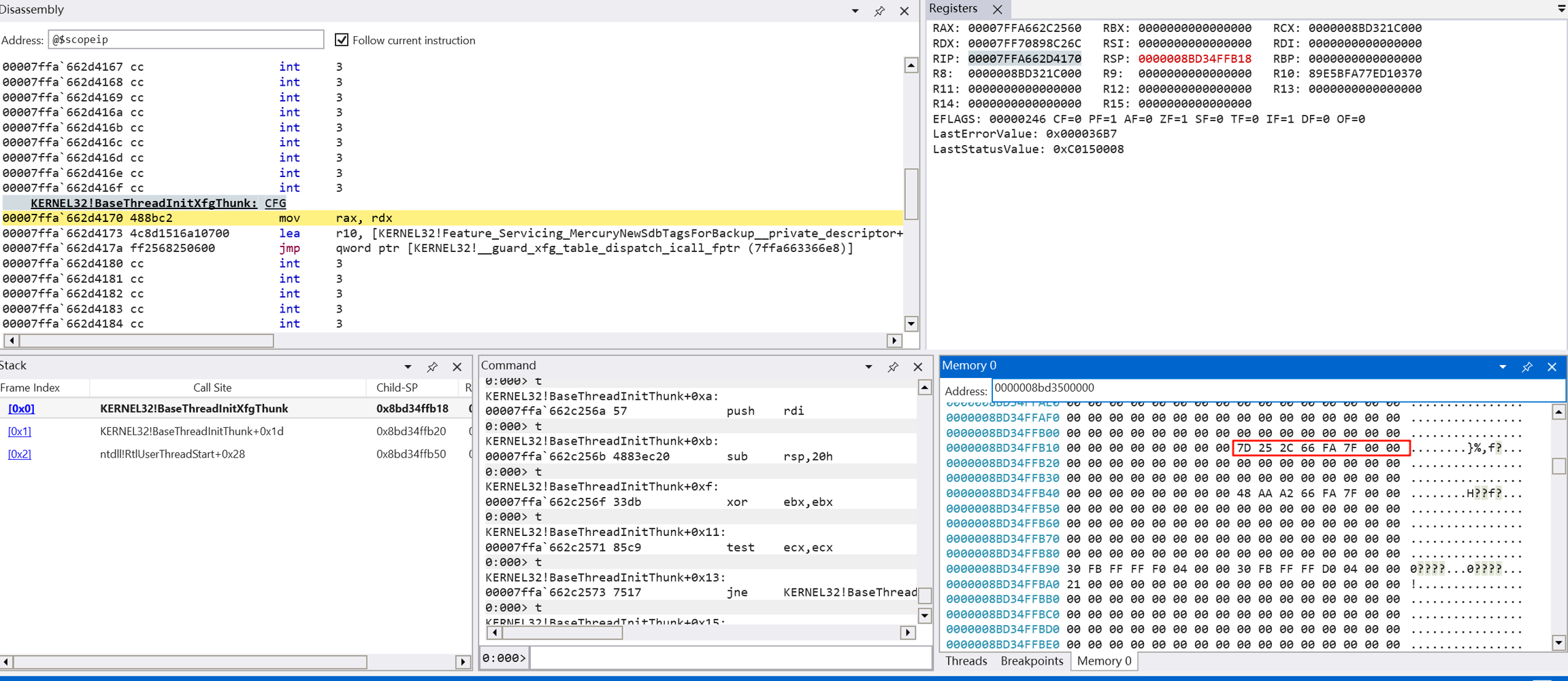 当我们执行到 call KERNEL32!BaseThreadInitXfgThunk 时,step into(F8),这时会在栈上留下第二个返回地址