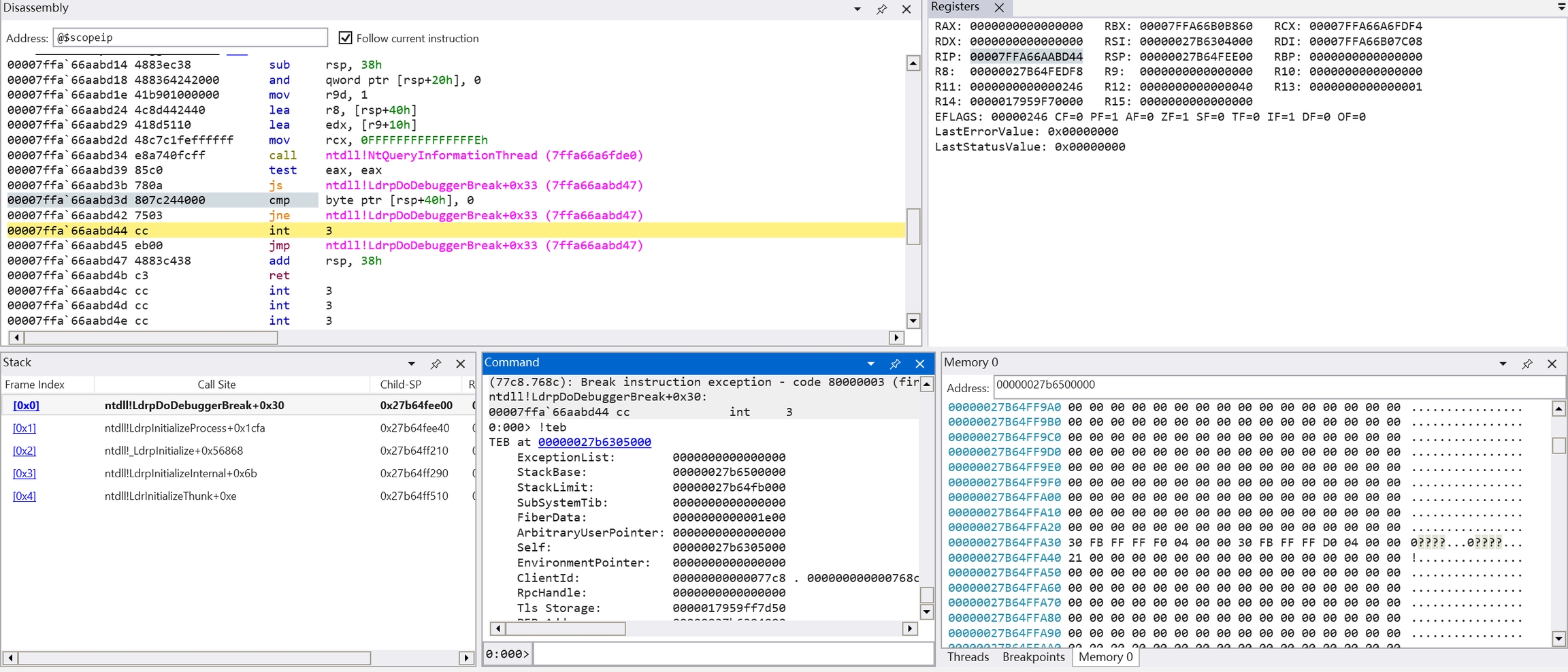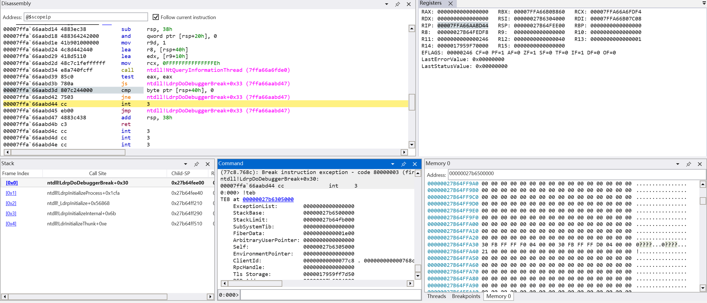 用windbg随便打开一个exe程序,程序会停在 ntdll!LdrpDoDebuggerBreak,接着我们在windbg的命令行输入一个下断点的命令:bp ntdll!RtlUserThreadStart。我们这么做的目的是跳过一些初始化操作,直接分析最感兴趣的 RtlUserThreadStart 和 BaseThreadInitThunk。