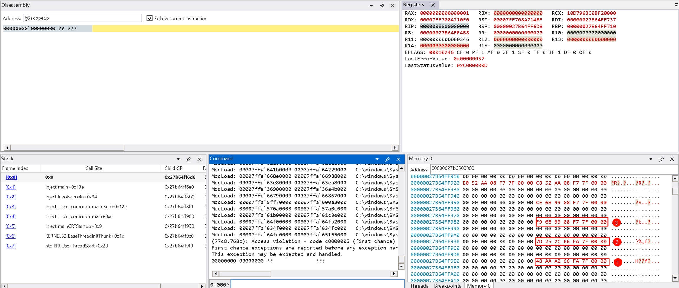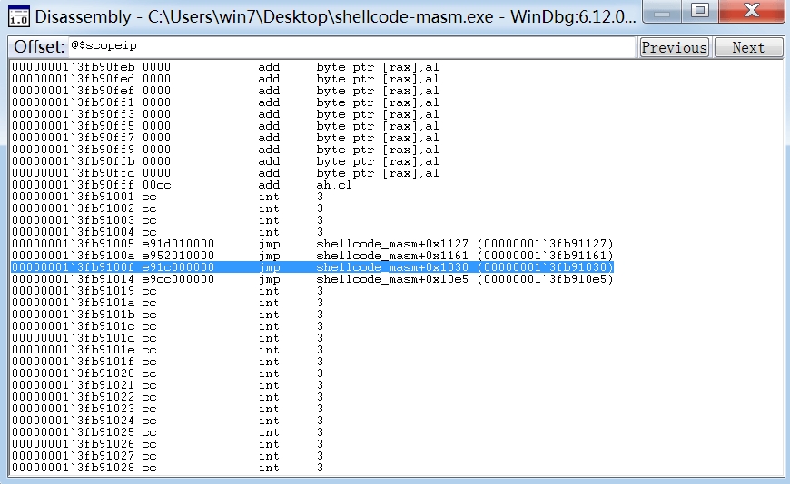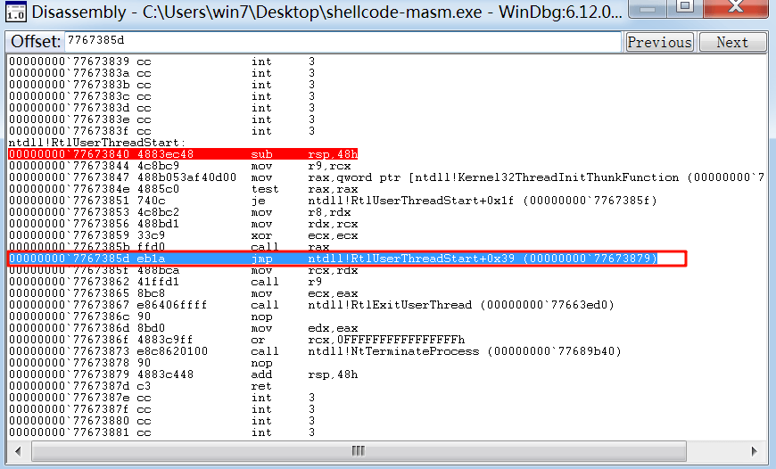 调用链为:ntdll!RtlUserThreadStart -> kernel32!BaseThreadInitThunk -> 用户自定义入口点,为了分析出错点,我们需要去看自己编写的汇编代码哪里出错了,所以接着就是来到用户自定义入口点处,一直按step into(F8)即可。