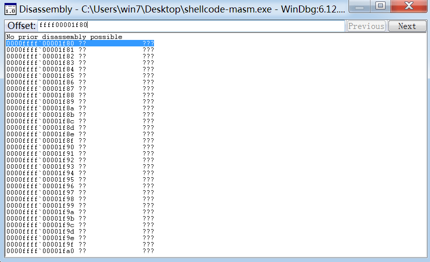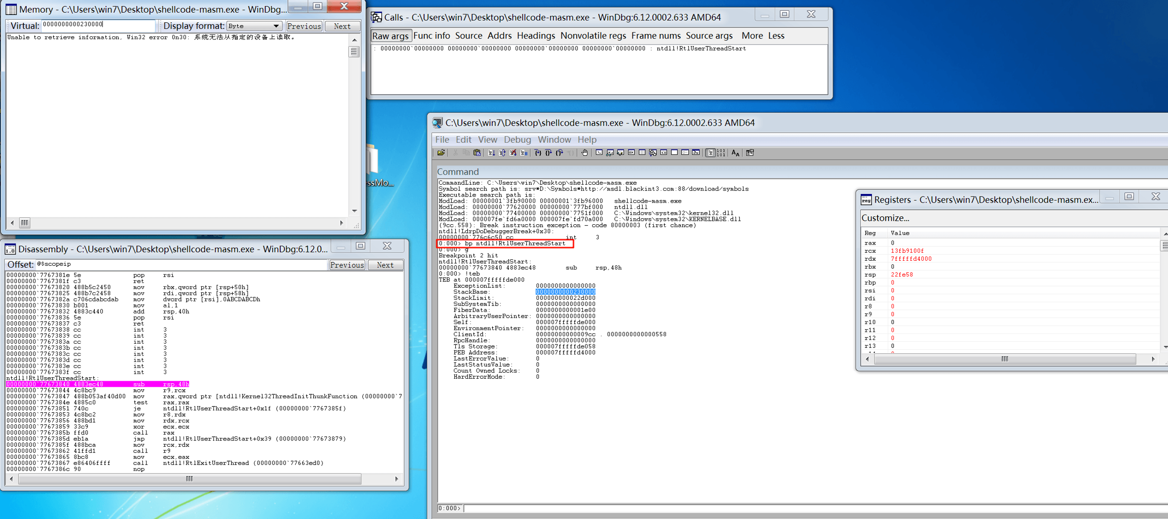 为了查明win7出错的原因,我需要用windbg去动态调式汇编代码编译后的exe程序。