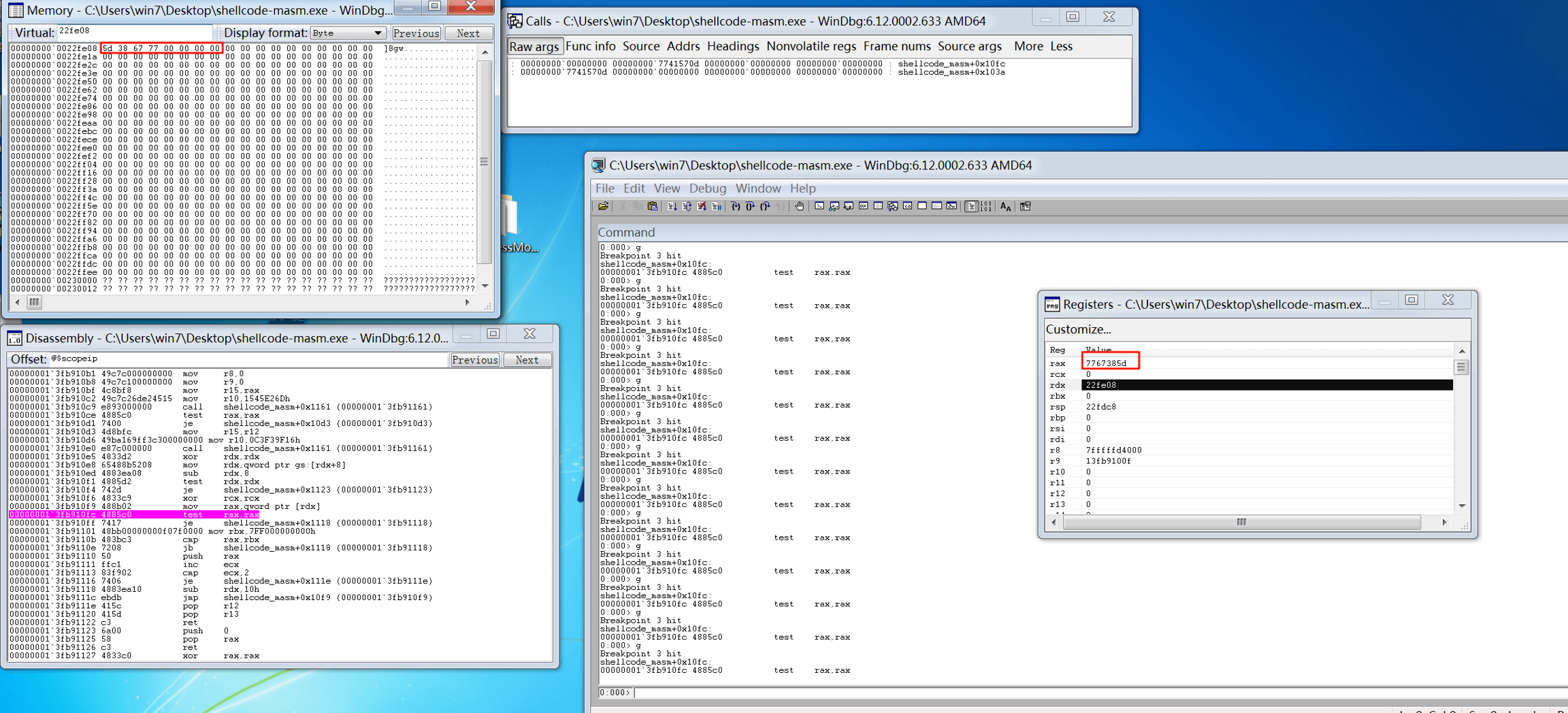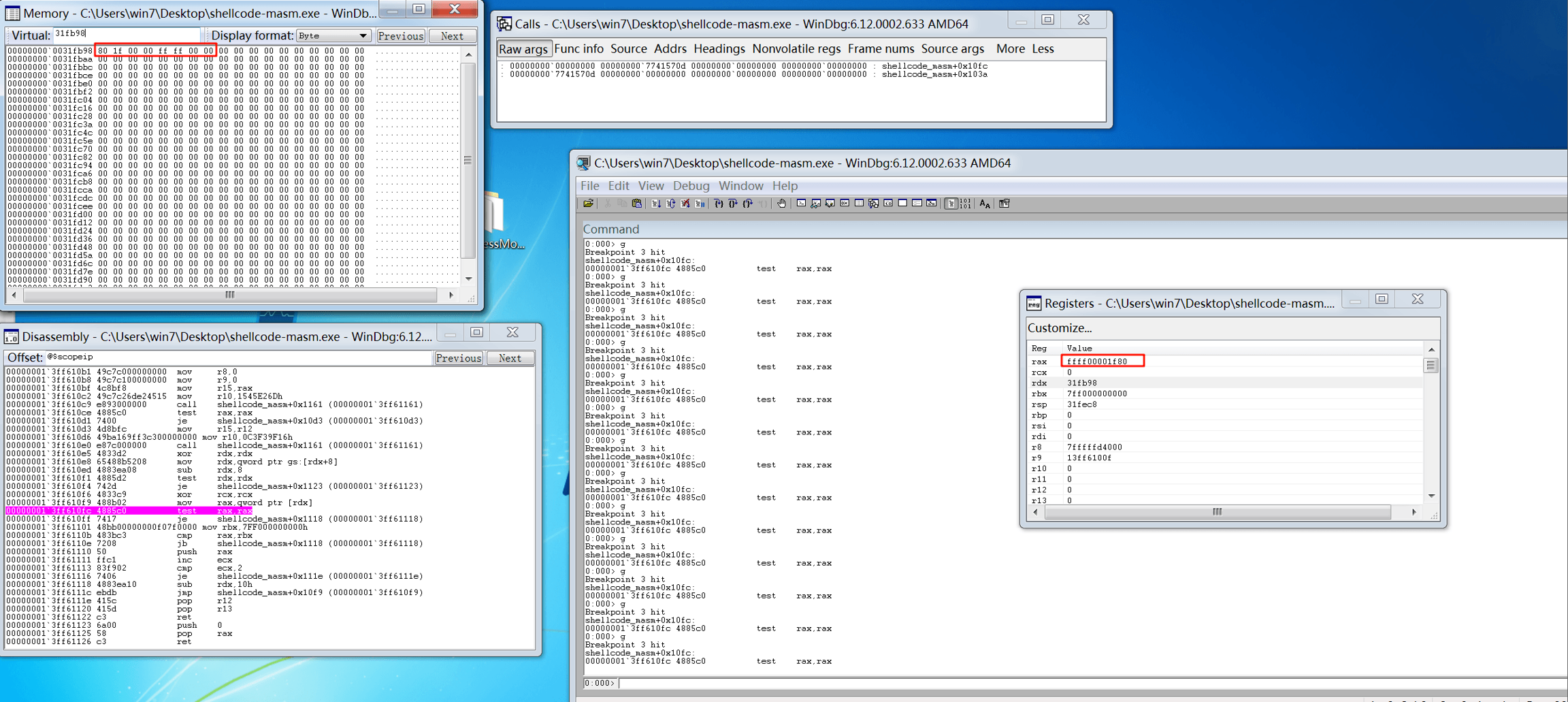 编写自定义函数比较随心所欲,不必完全按照x64的调用约定,但是在调用与windows API有关的函数时就要格外注意参数传递、对齐、影子空间等。