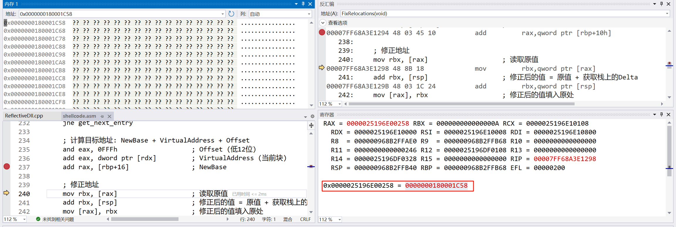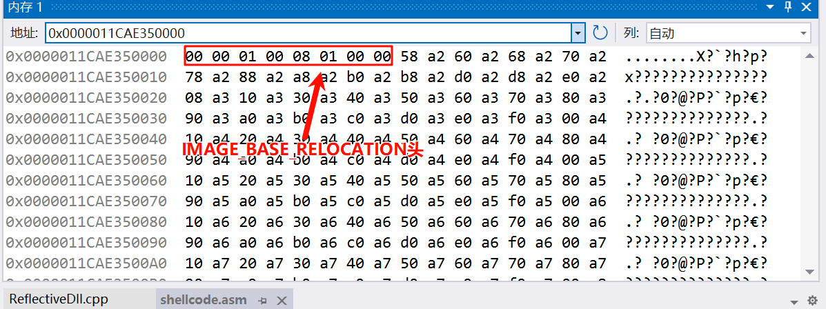 在SRDI中,我们通过VirtualAlloc给待加载的PE文件分配内存空间,由于系统随机分配内存地址,分配的基址往往与PE文件预期的加载基址(ImageBase)不一致。此时,需要通过重定位表对PE文件中所有硬编码的绝对地址进行修正,以确保程序能够正确运行。