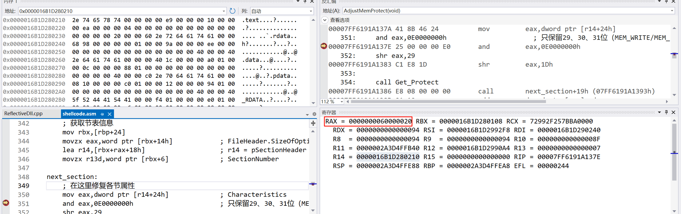 调整各节的内存保护属性(可选,但符合OPSEC):由于我们申请的内存是RWX权限,按照系统的PE加载流程,需要根据