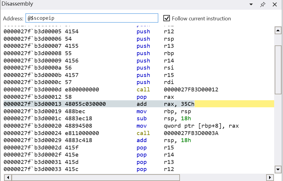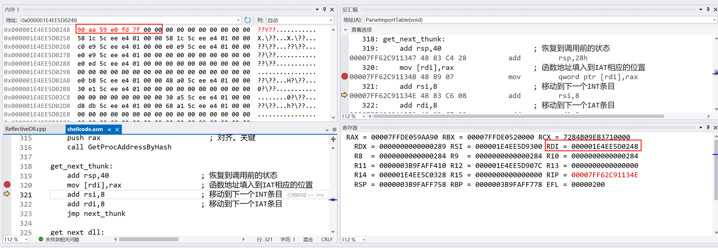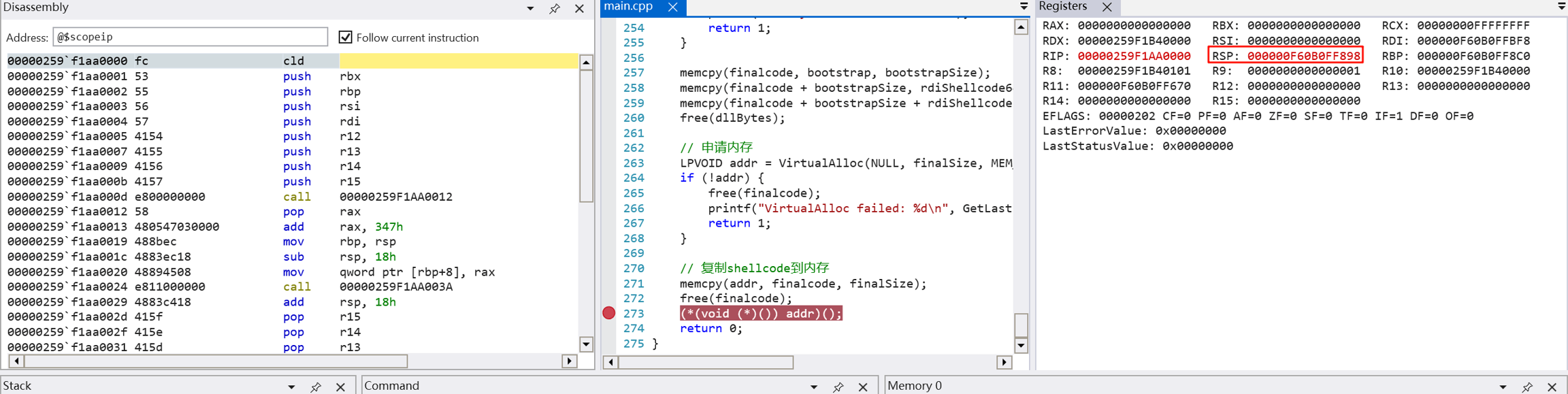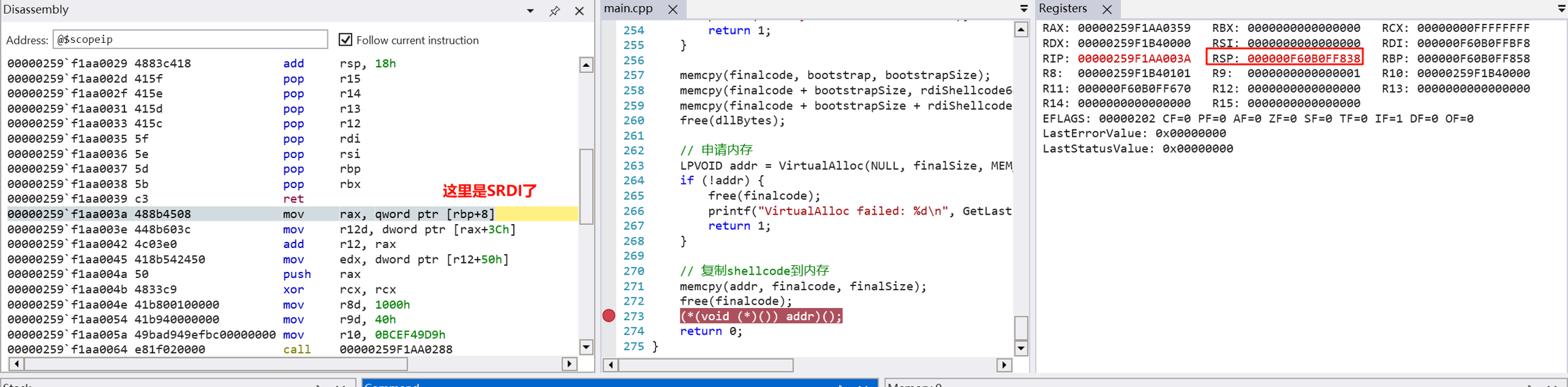 GetProcAddressByHash都会产生32字节的影子空间,为了确保执行完LoadPEIntoMemory64能够正确的返回到main中,需要清理这32字节的影子空间。