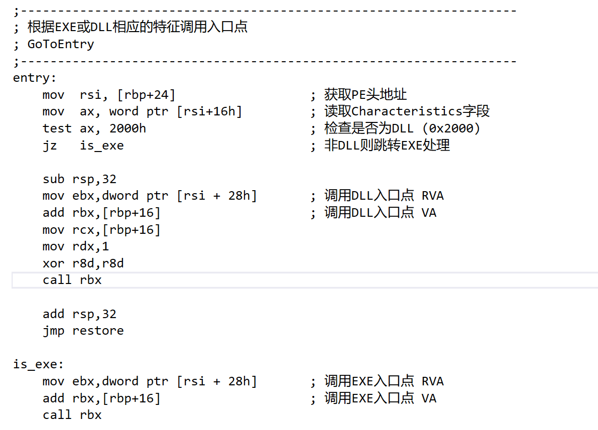 call func_offset指令将程序执行流重定向到内嵌的导出函数ReflectiveLoader,实现相对简单。只支持DLL文件。