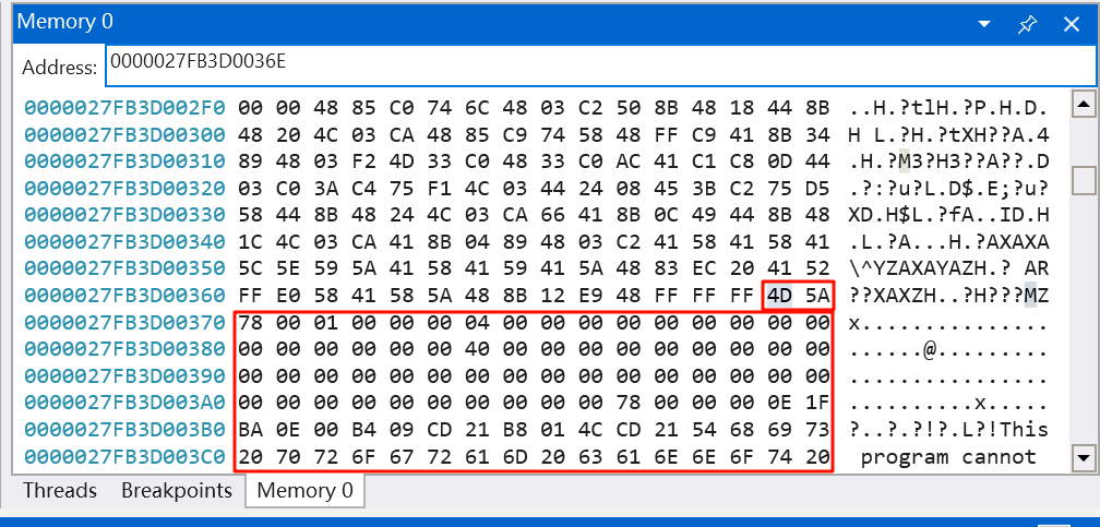调用VirtualAlloc分配内存,并将分配的内存基址作为新DOS头地址(基址),存储在